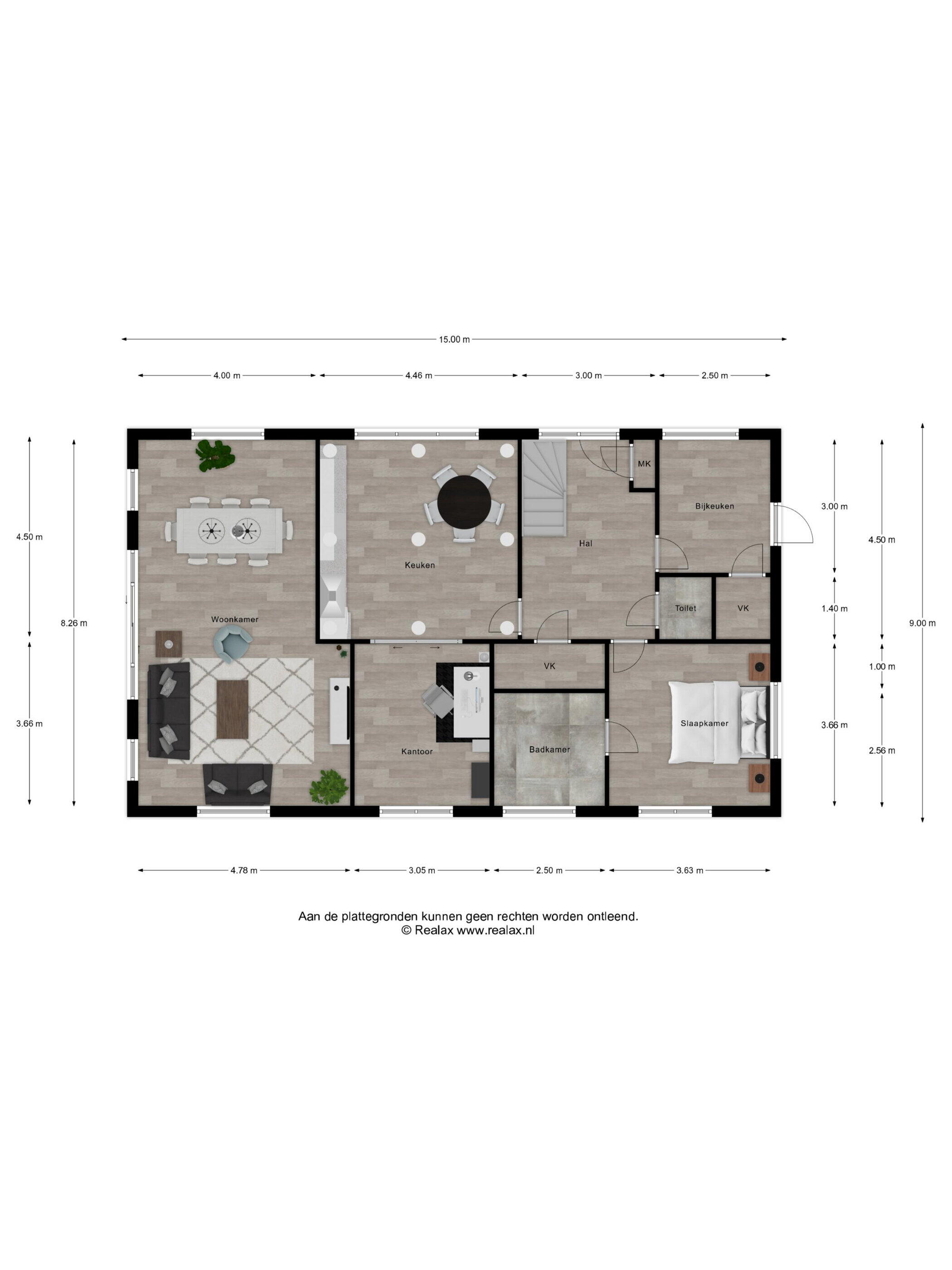 Begane grond: Vanuit een ruime hal heb je toegang tot de meterkast, de bijkeuken met vaste kast, een separaat toilet, slaapkamer met draai/kiepraam en aansluitende badkamer, cv-ruimte en de woonkeuken. De woonkeuken geeft middels schuifdeuren toegang tot het kantoor en de woonkamer. De en-suite woonkamer is lekker licht door de vele grote ramen tot aan de grond en de schuifpui naar de tuin.